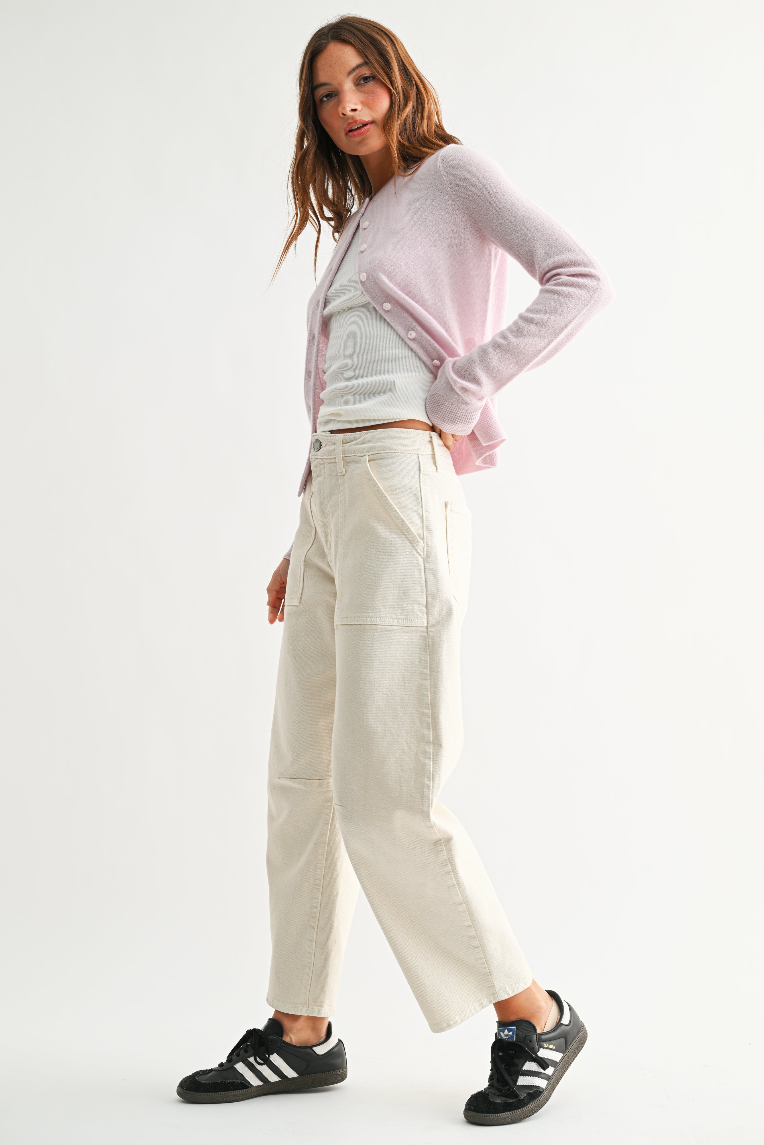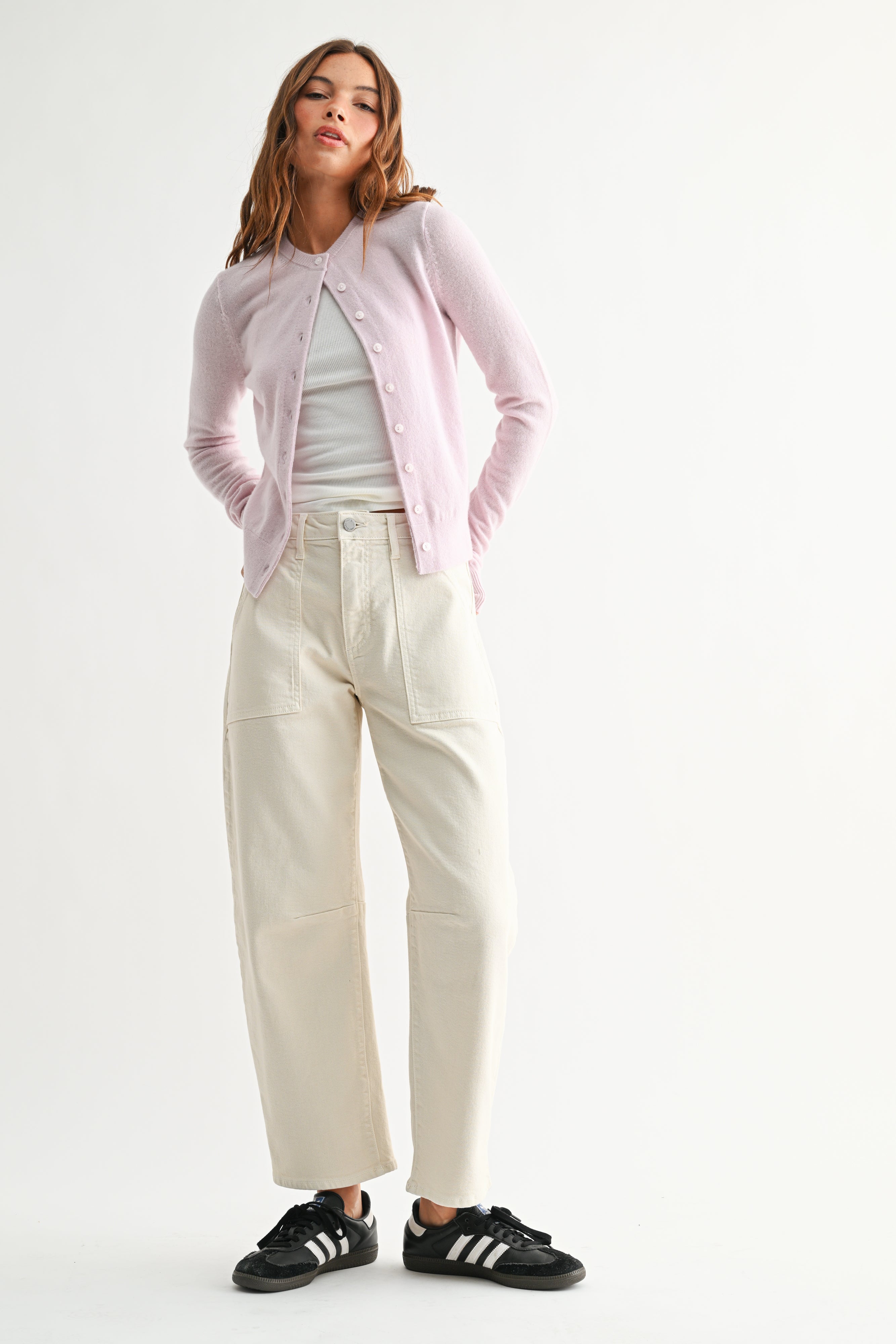 With a chic mid-rise fit, these jeans provide the perfect balance of comfort and tailored elegance, ideal for long-lasting wear throughout the day. Its front patch pockets add a distinctive, utilitarian touch, while the barrel-shaped leg creates a relaxed, slightly tapered fit for a laid-back, on-trend look.